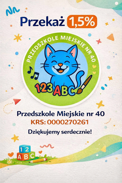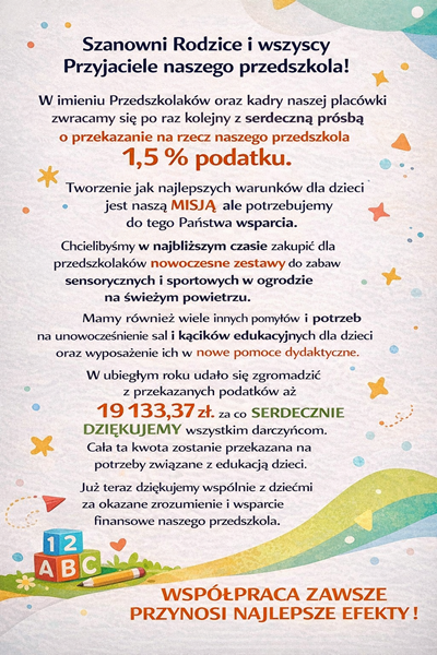 Zachęcamy Szanownych Państwa do przekazania 1,5% na rzecz naszego przedszkola. Dziękujemy.