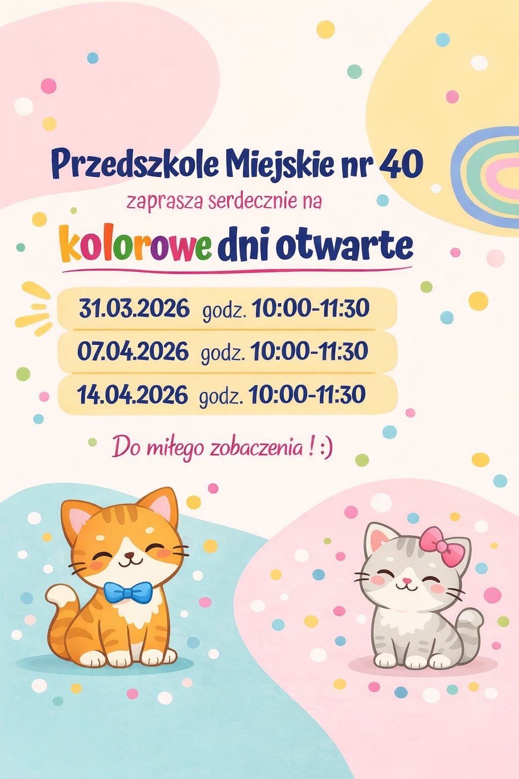 Serdecznie zapraszamy na dni otwarte dla nowych dzieci i rodziców zainteresowanych zapisaniem dzieci do naszego przedszkola na nowy rok szkolny. Oto terminy: