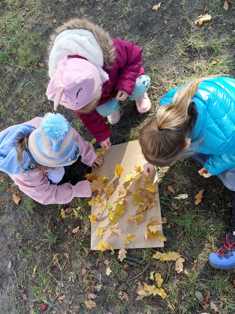 - Prace o tematyce jesiennej z wykorzystaniem różnorodnych technik plastycznych: „Grzyby – wyklejanie kulkami bibuły”, „ „Dyniowe lampiony ze słoika i bibuły”, Ludziki z kasztanów i żołędzi oraz plasteliny”, „Jesienne drzewo” – praca zespołowa, malowanie farbami, „Jesienne brzozy” – praca z gazety i farb plakatowych, „Kasztanowce” – wyklejanka, „Muchomorki” – przestrzenna praca plastyczna z platonki po jajkach, patyków, mchu i piasku.
