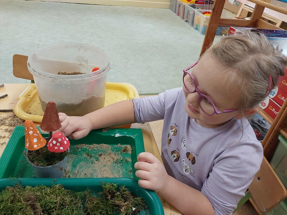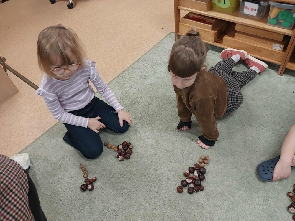 - Rozwijanie umiejętności matematycznych z zakresu segregowania materiału przyrodniczego, przeliczania elementów i dopasowywania cyfr do zbiorów. Praca z pomocami montessoriańskimi, klockami Dienesa, naturalnymi okazami (szyszki, kamienie, pestki, guziki itp.), wykorzystywanie spontanicznych, naturalnych sytuacji np. przeliczanie dzieci w grupie, porównywanie o ile więcej dziewczynek?, o ile mniej chłopców? itp.