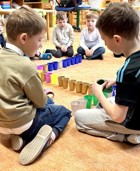 - Matematyczne zabawy z klasyfikowaniem, grupowanie przedmiotów, określanie mniej, więcej, tyle samo.