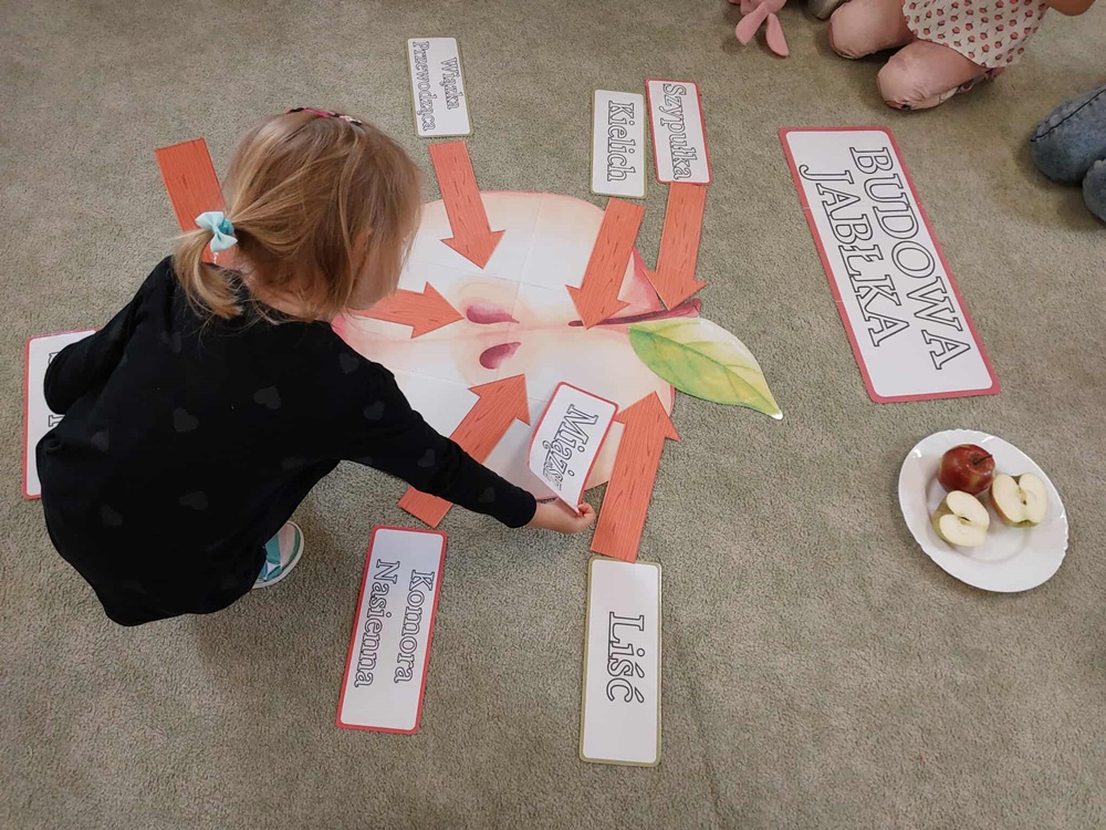 - „Dzień jabłka” – polisensoryczne poznanie owocu, oglądanie, wąchanie, smakowanie różnych gatunków jabłek, poznanie ich nazw , budowy.